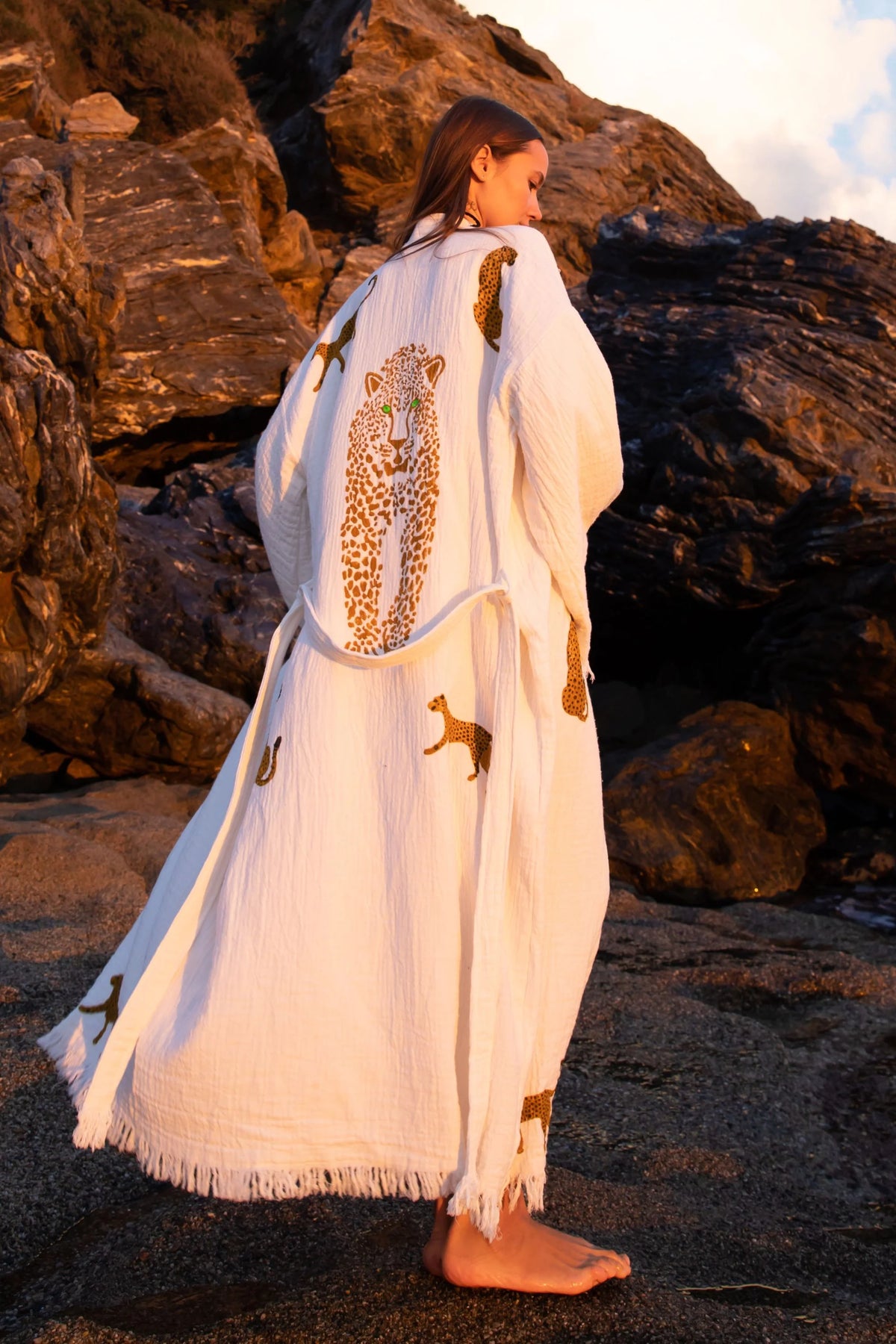 Unleash your wild side with this striking leopard print kimono, crafted from luxuriously soft organic Turkish cotton. Perfect for lounging in bold style or layering over your favorite outfits, this daring piece brings untamed elegance to any moment. The breathable fabric drapes beautifully while keeping you comfortable, making it an essential addition to your wardrobe for those who dare to stand out.