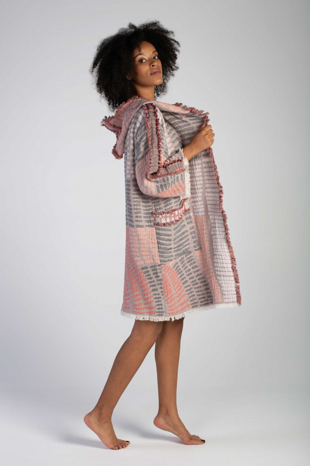 Our Nerite Turkish bathrobe features a breathtaking luxurious texture hand-loomed by artisans. It is extremely breathable, lightweight, absorbent, and SOFT! Perfect for lounging or after a soothing bath. Bring the look and feel of the spa to your home! This robe features two large front pockets and a cozy hood. Fringed edges complete this unique look. After one wear, our robe will be irreplaceable in your daily routine.